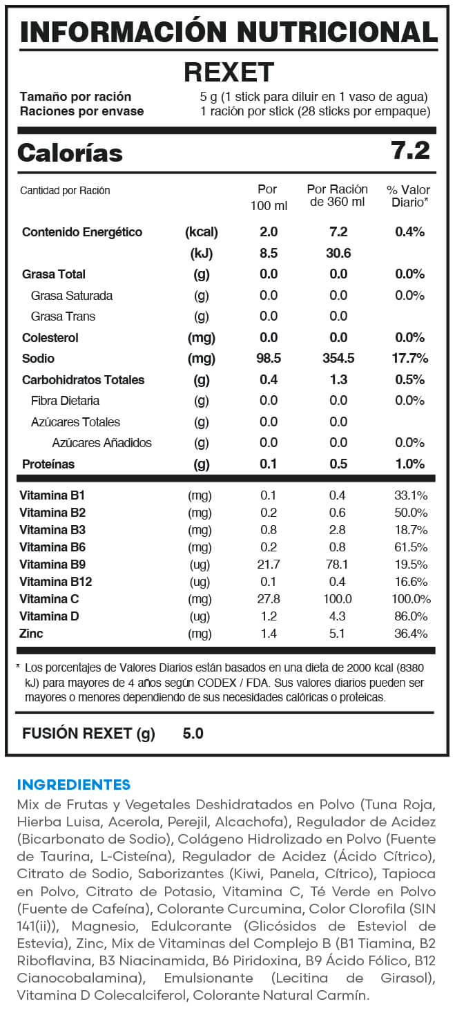 MIX DE EXTRACTOS VEGETALES (TUNA ROJA, ALCACHOFA, HIERBA LUISA, PEREJIL, ACEROLA, CLOROFILA) + BICARBONATO DE SODIO + MIX DE MINERALES (ZINC, MAGNESIO) + TAURINA + VITAMINAS DEL COMPLEJO B, VITAMINA C Y D + ACETILCISTEÍNA